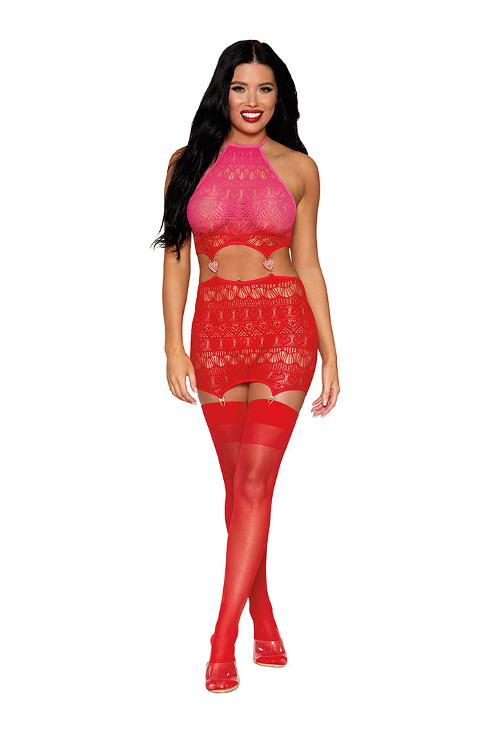 Vinyl halter neck teddy with deep V front trimmed in nail heads and back clip closure.