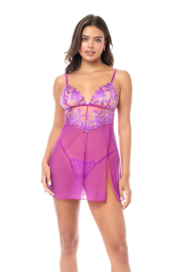 A one-of-a-kind babydoll crafted in sheer mesh with beautiful floral embroidery. Features adjustable straps for a customizable fit and comes with a matching panty for a romantic, effortless look.