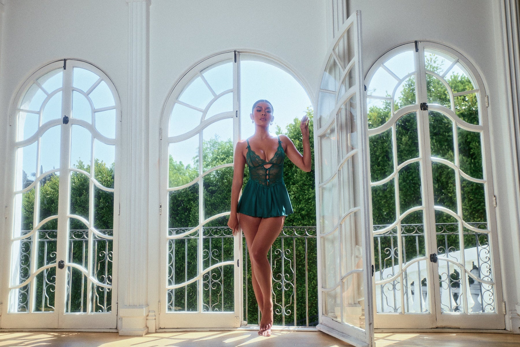 - Chantilly stretch lace and mesh - Chiffon gathered skirt - Plunge bralette cup - Satin trim and ribbon bow detail - Single string thong back - Cotton gusset